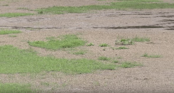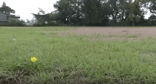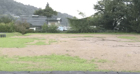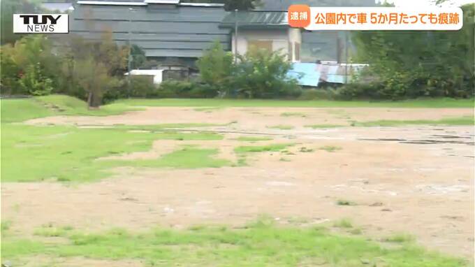 佐藤真優アナウンサー「山辺町の大寺ふれあい公園です。全面芝生だった公園に土を入れてドリフト(被害)の凹凸を整えました。しかし、今も芝は生えそろっていません」