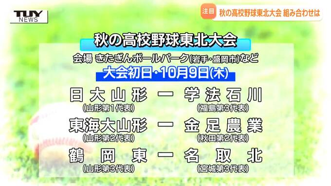山形第1代表の日大山形は福島第3代表の学法石川と、山形第2代表の東海大山形は秋田第2代表の金足農業と山形第3代表の鶴岡東は宮城第3代表の名取北との対戦です。