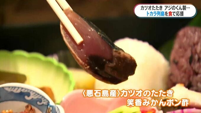 使われている食材のほとんどが、6月以降、地震が続いているトカラ列島・十島村でとれたものです。7つの有人島からなる十島村の食の豊かさを知り、食を通じて応援してもらおうと企画されました。