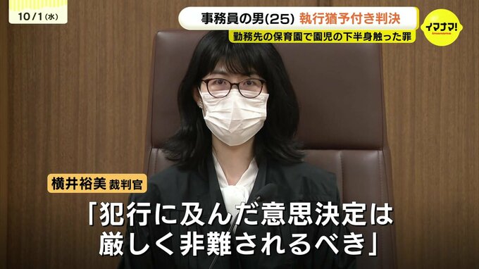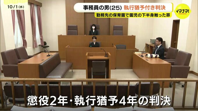 判決によりますと、保育園で事務員として働いていた男(25)は、去年10月から11月頃、勤務する広島市内の保育園で当時6歳の女子園児の下半身を触りました。