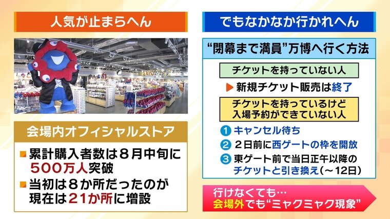 会場内のオフィシャルストアの累計購入者数は、8月中旬に500万人を突破。当初は8か所だったショップは、現在21か所と爆発的に増設されています。会場に行かなければ買えないコラボ商品などに人々が殺到しているということです。