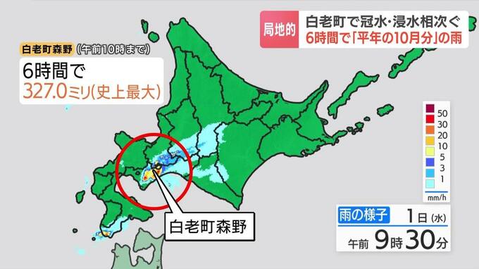 白老町森野では午前10時までの6時間に、記録的短時間大雨情報を2回観測するなど、観測史上最大となる327ミリの記録的な大雨となりました。