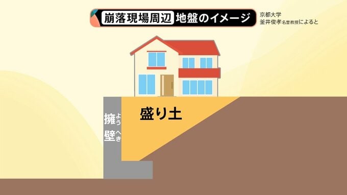 崩落現場の周辺地盤のイメージで見ますと、現場は高低差がありますので、盛り土をして擁壁を作っていました。その上に住宅を建てていた。この擁壁内の盛り土の圧力が変わってきたということです。