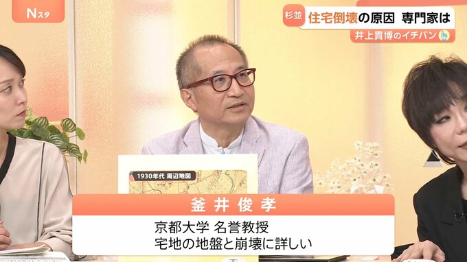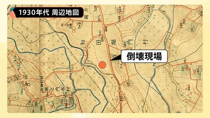 「1930年代の倒壊現場の周辺地図」を見ますと、北側(右)に川があります。この川が侵食して低地を作っていました。