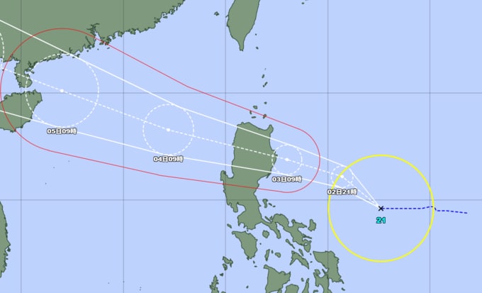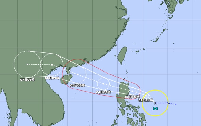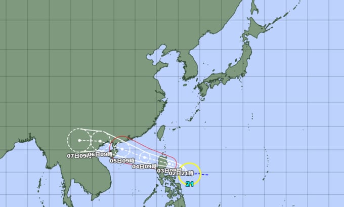 48時間後の4日9時には南シナ海の北緯18度20分、東経117度10分を中心とする半径130キロの円内に達する見込みです。