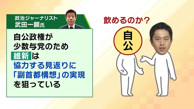 「副首都構想」をめぐっては、政治的な思惑が絡んでいます。政治ジャーナリストの武田一顕氏は「自公政権が少数与党のため、維新は協力する見返りに『副首都構想』の実現を狙っている」と指摘。一方、与党側は維新・国民民主を天秤にかけて、どちらに協力を仰ぐべきか検討しているのではないかと見ています。