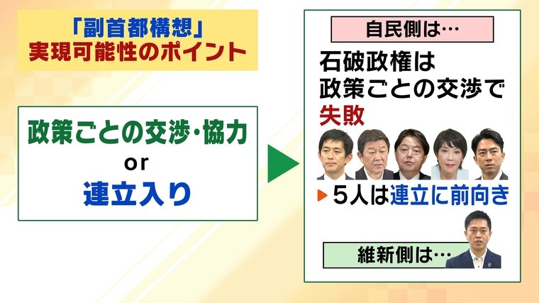 また、仮に維新が連立政権入りした場合、「副首都構想」の実現に大きく影響しそうです。与野党の協力体制としては、「パーシャル連合(政策ごとの交渉・協力)」と「連立入り」の2種類がありますが、パーシャル連合を採用してきた石破政権が参院選で敗北したことで、総裁選候補者の5人は連立に前向きな姿勢を見せています。