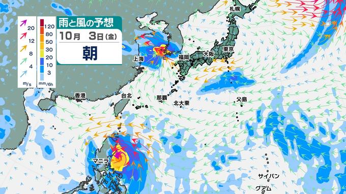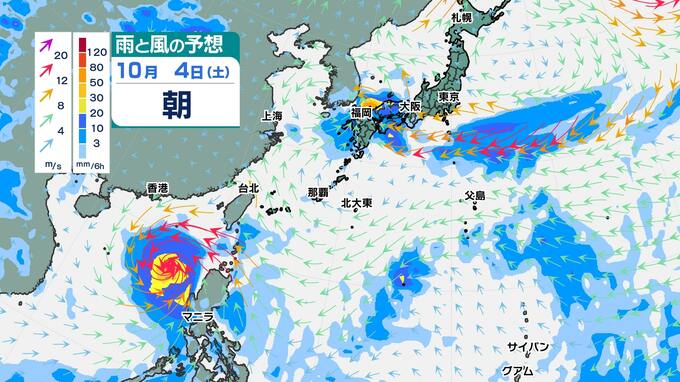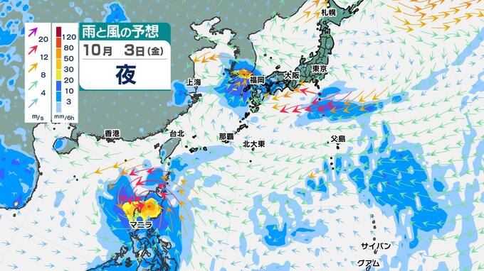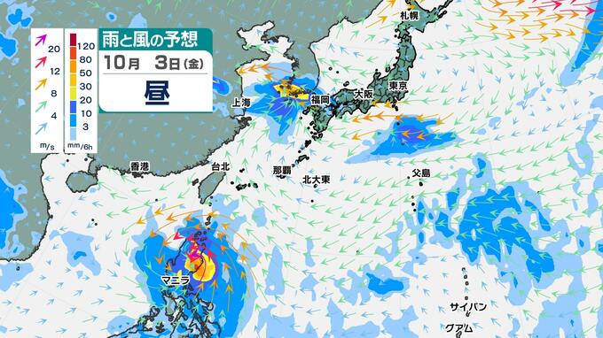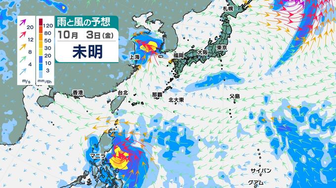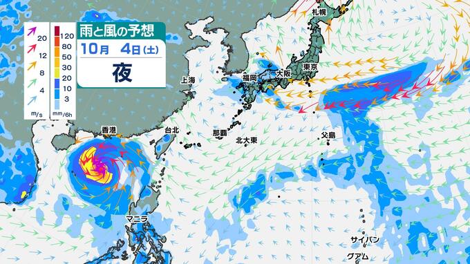 シミュレーションでは、台風21号の「反時計回りの渦」が、フィリピンを東から西に横断する予想となっています。その後、香港の南を通り東南アジアに向かいそうです。またこれとは別の「反時計回りの渦」が、7日(火)グアムやサイパンの西の海上に現れます、「渦」としては不明瞭ながら北西方向に進んでいきそうです。