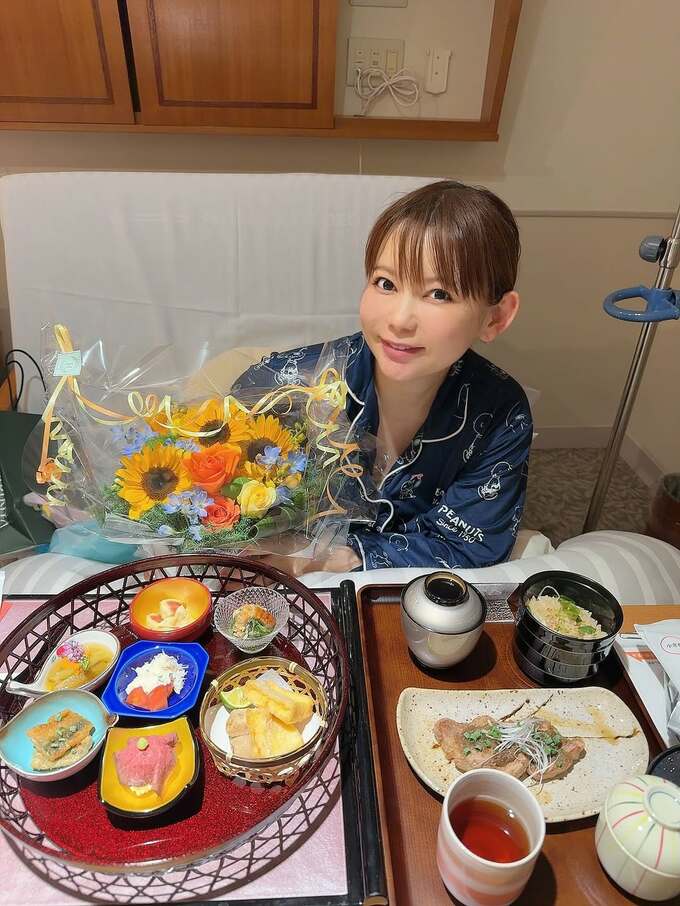 中川さんは「ずーっと楽しみだったお祝い膳がついにでました!ウニ、カニ、松阪牛!バンザイ!!頑張って良かった〜!!」と病院食の豪華さにも感激している様子が伝わってきます。