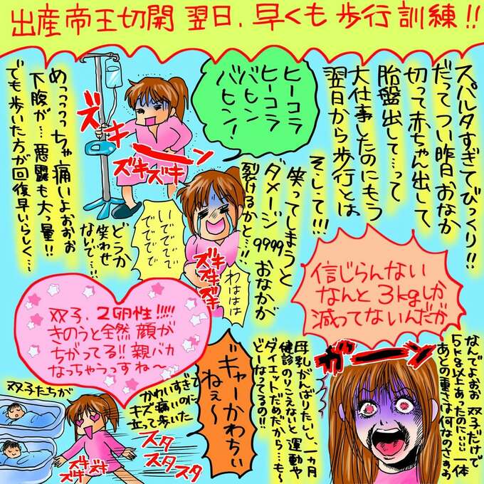 中川さんは、「きのうお腹切ったのに今日から強制歩行訓練、、、!」と報告。「笑うと地獄みたいにお腹いたい 産んだ後もこんなに試練だらけだとは、、、!」とコメントし、産後の苦労を絵日記に記しています。
