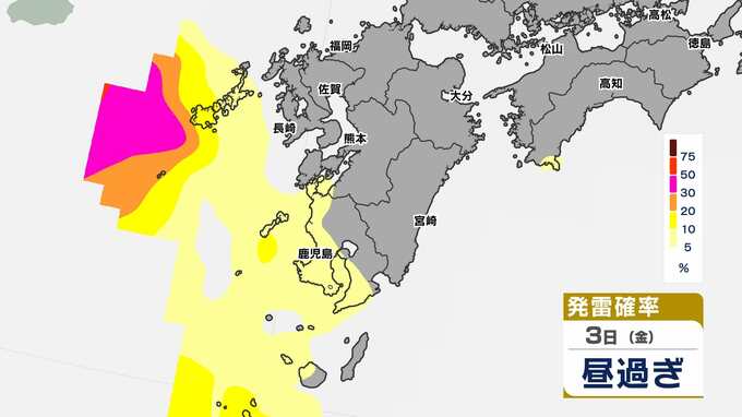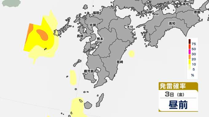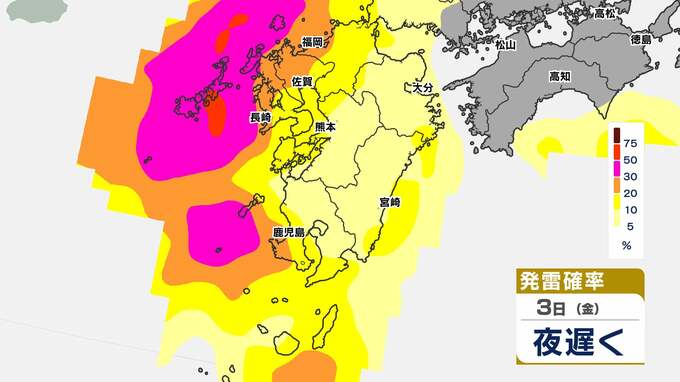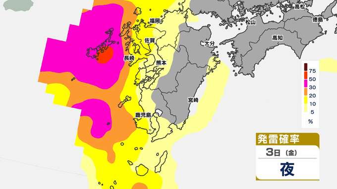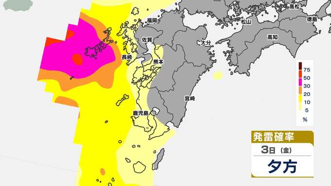 《発雷確率》つまり雷の発生確率は、大気の状態の目安です。確率が高ければ〈大気の状態が不安定〉で、それだけ〈急な激しい雨〉や〈雷〉〈突風〉〈ひょう〉などが発生する可能性が高くなります。3日(金)4日(土)は「雷注意報」の発表があるでしょう。発雷確率のシミュレーションは画像で確認できます。