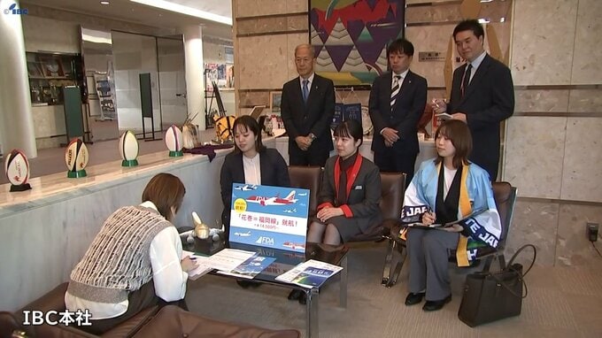 いわて花巻空港と福岡空港をつなぐ路線が10月に新たに就航するのを前に、2日関係者がIBCを訪れ路線をPRしました。