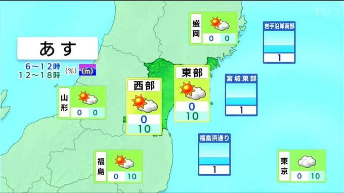 一日を通して、よく晴れるでしょう。風はおだやかで、波の高さは1メートルの予想です。