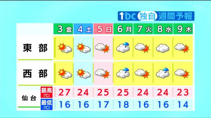 5日(日)にかけては晴れや曇りで、天気の大きな崩れはないでしょう。月曜日と水曜日は、気圧の谷の影響で雨が降る見込みです。最高気温・最低気温ともに平年より高い日が多いでしょう。