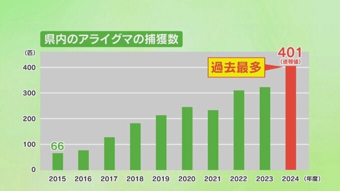アライグマの捕獲はほぼ右肩上がりで増加し、昨年度は過去最高の401匹で10年前の6倍に上っています。