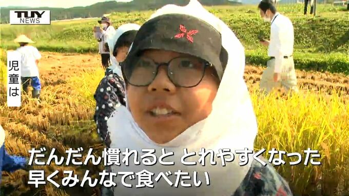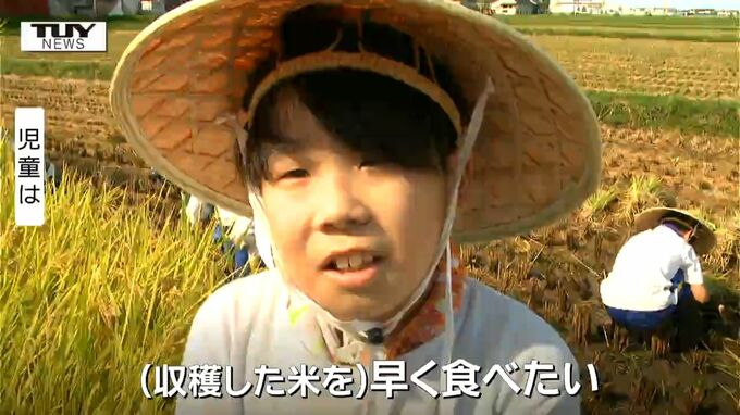児童「鎌で稲を刈って切るのが固くて難しかった。(収穫した米を)早く食べたい!」