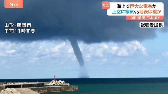 きょう昼前、山形県庄内地方の沖合で竜巻とみられる現象が見られました。こちらは、きょう午前11時すぎ、山形県庄内地方鶴岡市の沖で発生した巨大な竜巻のような現象。視聴者の方が、動画を撮影してくれました。天…