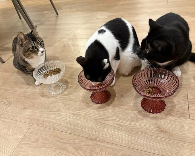 藤さんが投稿した写真には、右端にいるじゃこ天が、いつもの調子でカリカリを食べるマルとオレオの側を神妙に見つめていて、視線に気づいたマルがじゃこ天を見返しています。その間にいるオレオはマイペースで食べ続けている様子。