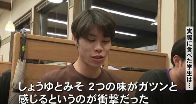 ラーメンを食べた学生「最初は結構濃かったが、コーヒーフレッシュを入れるとまろやかになる、飲みやすかった」「しょうゆとみそ、2つの味がガツンと感じるというのが衝撃だった」「自分はけっこうがっつり系すきなので、これははまると思う」