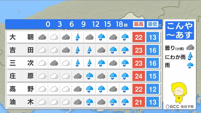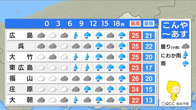 移動性高気圧は東へ移動し、大陸からは次の低気圧や前線が近づきます。あすは朝から雨が降ったりやんだりで、午後を中心に断続的に降る見込みです。雨脚が強まる時間もあるでしょう。