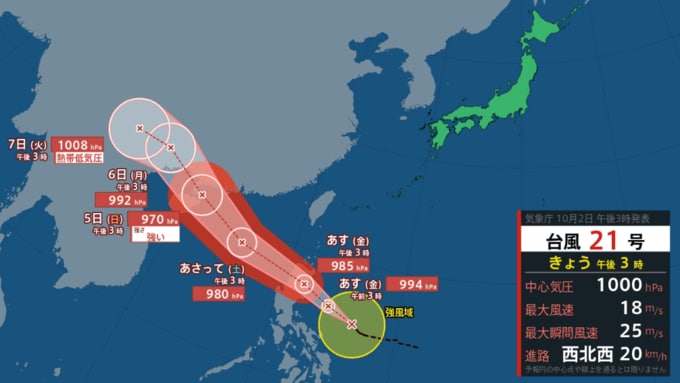 気象庁によりますと、台風21号は2日午後3時現在、北緯15度10分、東経126度25分付近に位置し、時速20kmで西北西に進んでいます。中心気圧は1000hPa、中心付近の最大風速は18m/s、最大瞬間風速は25m/sとなっています。