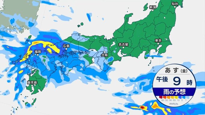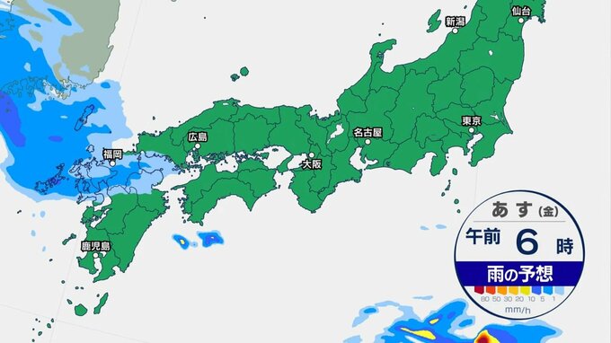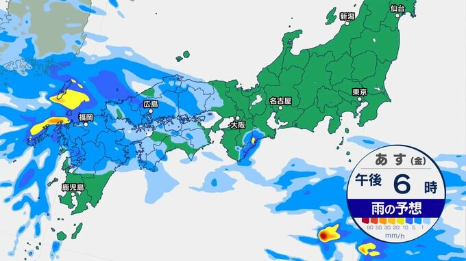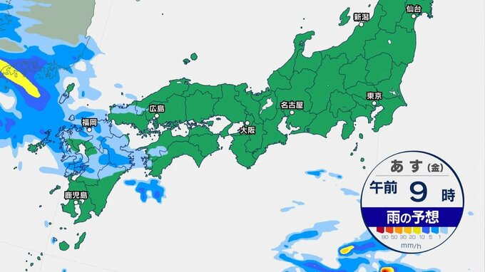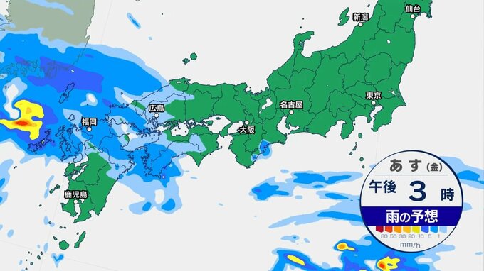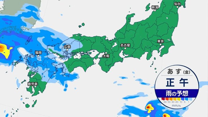 木曜日は広く高気圧に覆われて、日差しが届き、この時期としては各地で気温が上がりました。ただ上空の寒気の影響で、北日本では木曜日夜も大気が不安定のため、急な雷雨に注意をしてください。金曜日になると前線の影響で西日本では雨が降り、夕方以降は、前線に近い九州北部を中心に激しい雨や雷雨となる所がある予想です。また、北陸から北海道は晴れる所が多い見込みですが、関東や静岡県では一部で、午後はぱらっと雨が降る所がありそうです。