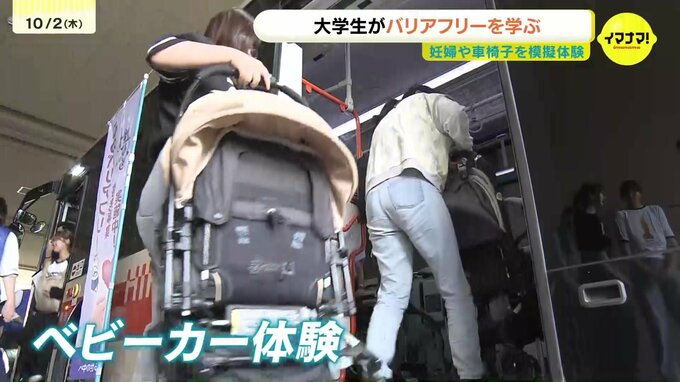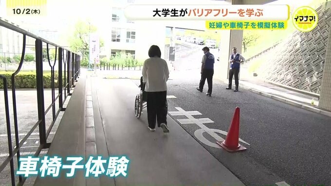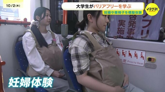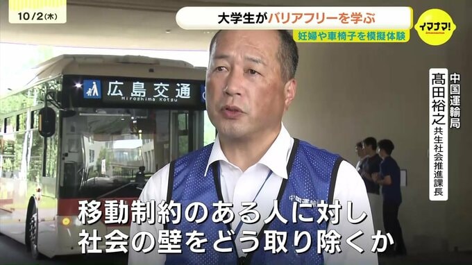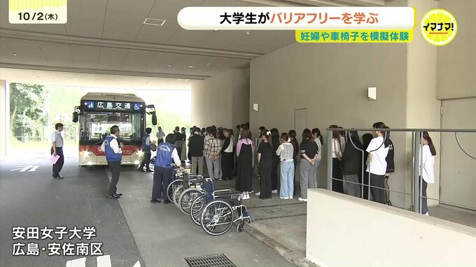 大学生たちが妊婦や車椅子を模擬体験するバリアフリー教室が、広島市で開かれました。