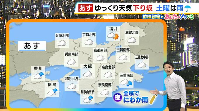 10月3日(金)の近畿地方は、ゆっくり天気が下り坂。南から雨が降りだす見込みです。 西から低気圧や前線が近づき、近畿地方には湿った空気が流れ込むでしょう。全般に雲の多い天気で、午後は南部で雨が降りだ…