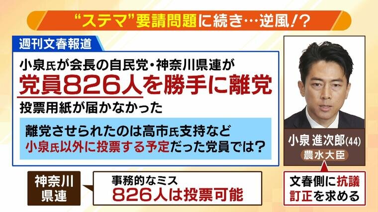 これについて神奈川県連は、事務的なミスで826人は投票可能だと述べています。また小泉氏本人も文春側に抗議訂正を求めると強く批判しています。