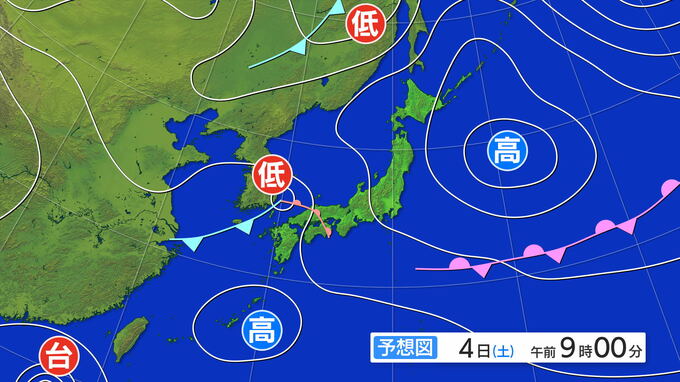 4日午前9時の予想天気図です。対馬付近に低気圧があって前線がのびています。