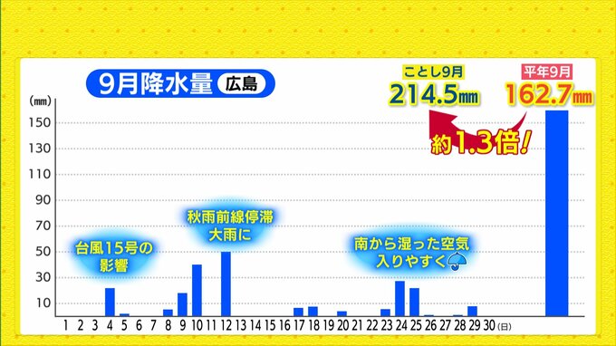また、広島市中区の9月の降水量は、214.5ミリで平年の約1.3倍で、降水量の多い9月となりました。8月は雨が降った日にかなり偏りがありましたが、9月は前線や低気圧の影響を受け、定期的に天気が崩れたことがわかります。