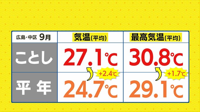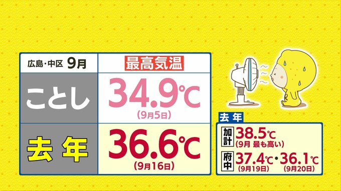 昨年は、広島市中区で9月16日に36.6℃を記録するなど、9月に10度猛暑日を記録しましたが、ことしは広島市中区で猛暑日を記録した日はなく、9月で一番高かった最高気温は、9月5日に観測した34.9℃でした。