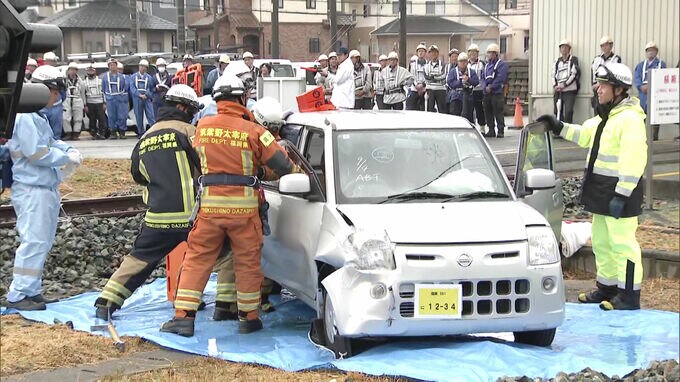 踏切内で軽乗用車と電車が衝突した想定で負傷者の救出手順などを確認する訓練が福岡県筑紫野市で実施されています。3日午前、西鉄の筑紫車両基地で行われた踏切事故の対応訓練には、乗務員や警察官、消防などおよそ…
