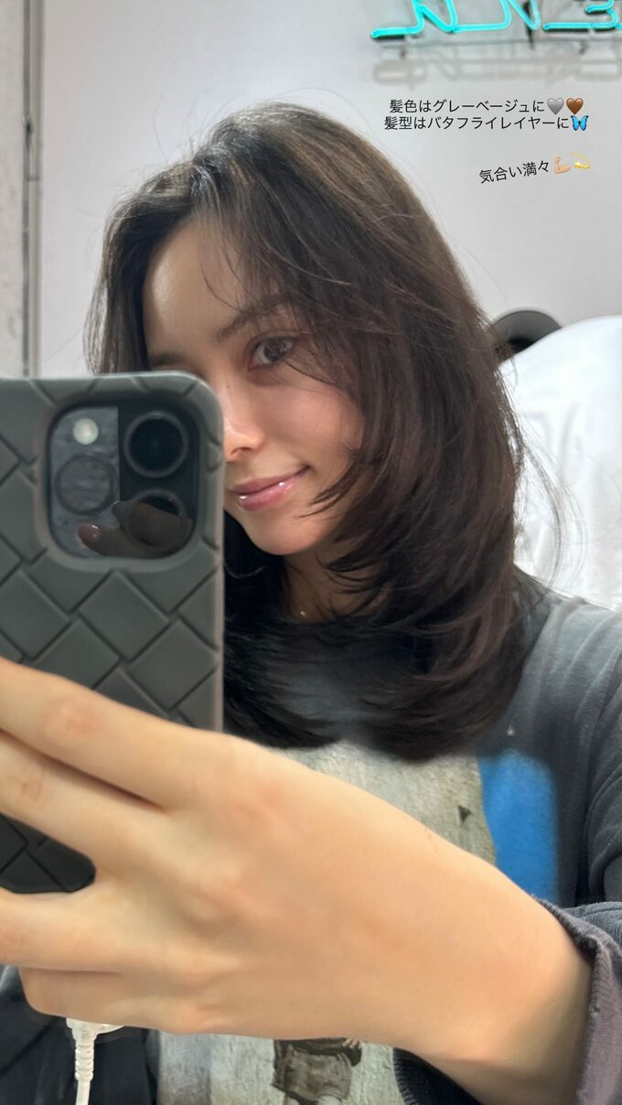 そして3枚目の画像では、鏡越しに自撮りをする滝沢さんの姿が写っており、左手でスマートフォンを握り、微笑みながら鏡に映る自分の姿を撮影しています。画面上のテキストには「髪色はグレーベージュに」「髪型はバタフライレイヤーに」「気合い満々」と記されており、仕事復帰に向けての 滝沢さんの意気込みが感じられます。