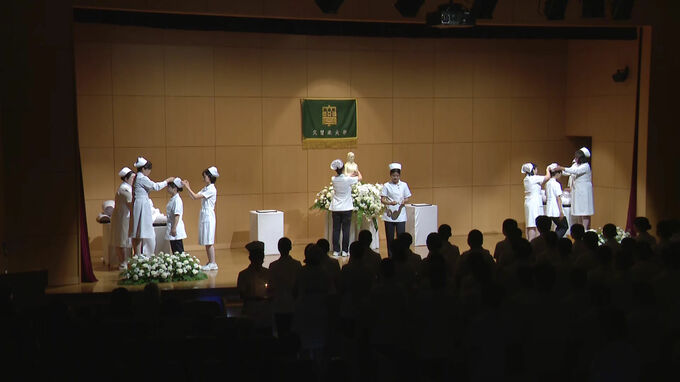 久留米大学で3日、看護師を目指す学生たちが、病院での実習を前にナースキャップを受け取る戴帽式に臨みました。