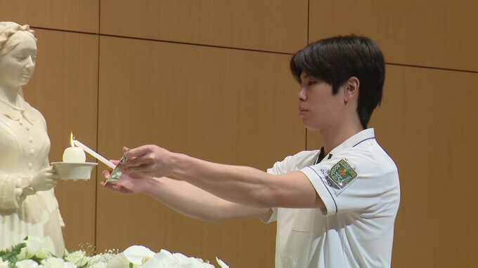 その後、学生たちは看護の象徴であるナイチンゲールの像からろうそくの灯を授かり、「命と向き合い、人の痛みに寄り添う」と誓いの言葉を述べました。
