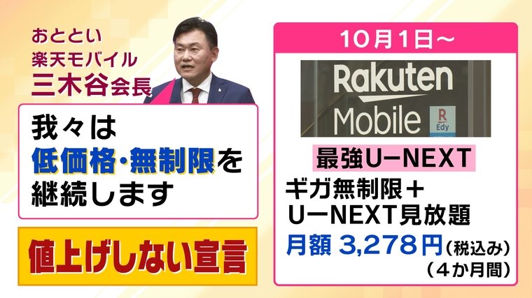 そんな中9月30日、楽天モバイル・三木谷浩史代表取締役会長は「我々は低価格・無制限を継続します」と、値上げしない宣言をしました。