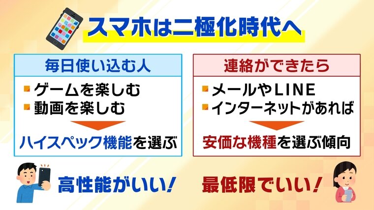 毎日ゲームや動画を楽しむ人はハイスペック機能を選び、メールやLINEなどの連絡、インターネットがあればいいという人は、安価な機種を選ぶ傾向があり、二極化してきているということです。