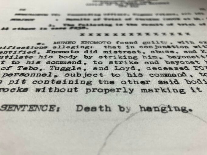 <榎本宗応は有罪判決を受けた。榎本は、名前が特定されている者と特定されていない者たちと一緒に、捕虜であるウォーレン・H・ロイド兵曹を虐待して殺害した。榎本は彼を殴って銃剣で刺し、また彼を殴って銃剣で刺すように部下に命令し、彼の身体を傷つけた。また、亡くなった捕虜のティボ中尉、タグル兵曹、ロイド兵曹の遺体を不名誉に埋め、彼の命令に従う者たちによって、ロイド兵曹の遺体をほかの遺体の入った処刑用の穴に蹴りこみ、墓として適切に表示することなく土と岩で覆わせた。判決:絞首刑>