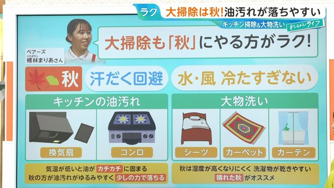 例えばキッチンの油汚れも気温が低いと油がカチカチに固まってしまいます。秋は冬より油汚れがゆるみやすく、少しの力で落とすことができます。