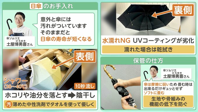 傘ソムリエの土屋博勇喜さんによると、意外と傘には汚れがついているので、そのままだと日傘の寿命が短くなってしまうそうです。