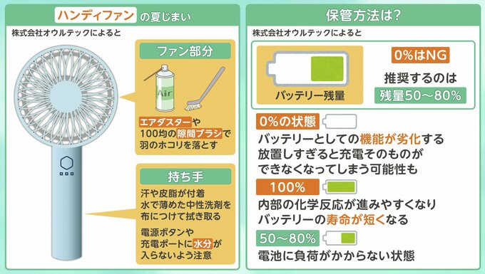 ハンディファン バッテリー何%で保管?