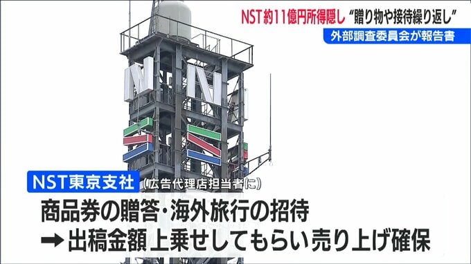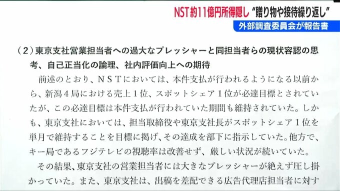 「NST 新潟総合テレビ」が、およそ11億円の所得隠しを指摘された問題。外部調査委員会が報告書をまとめ、『売り上げ1位』という過大なプレッシャーのもと、営業担当の社員が広告代理店の担当者に対し適正な事業活動の範囲を逸脱した贈り物や接待を繰り返していたと指摘しました。