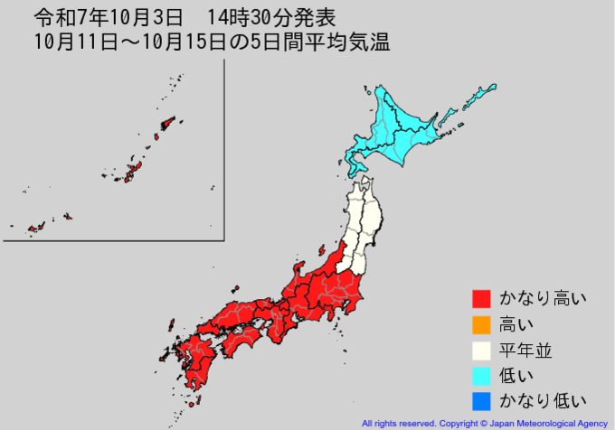 【2週間気温予報】東北地方の向こう2週間の気温は平年並か高い日が多い予報 8日頃まではかなり高い日も多い予報 農作物の管理などに注意 東北・全国の天気を画像で 気象庁 テレビユー山形 2025年10月3日(金) 15:52 国内 ■10月11日~10月15日の5日間平均気温 画像は気象庁より ・8日先から12日先まで5日間平均した日平均気温を表示しています。 ・かなり高い(かなり低い)は、かなり高い(かなり低い)気温となる確率が30%以上のときに表示します。