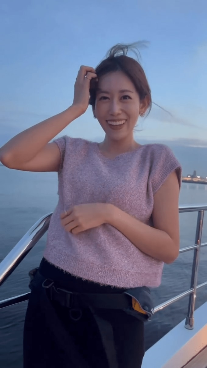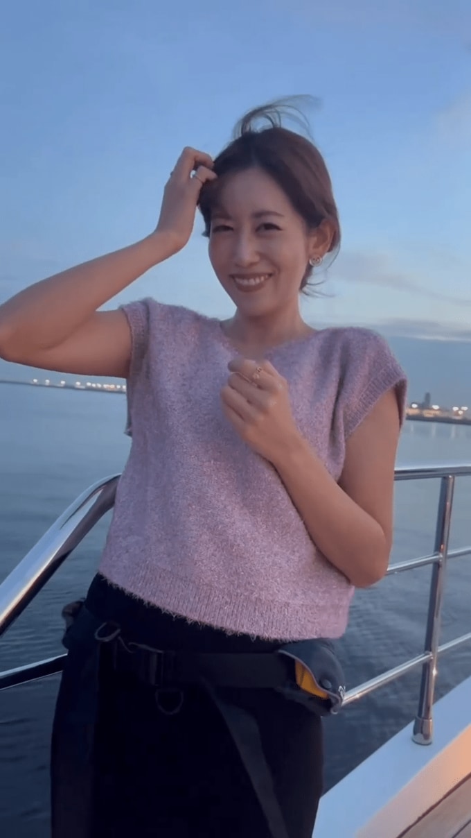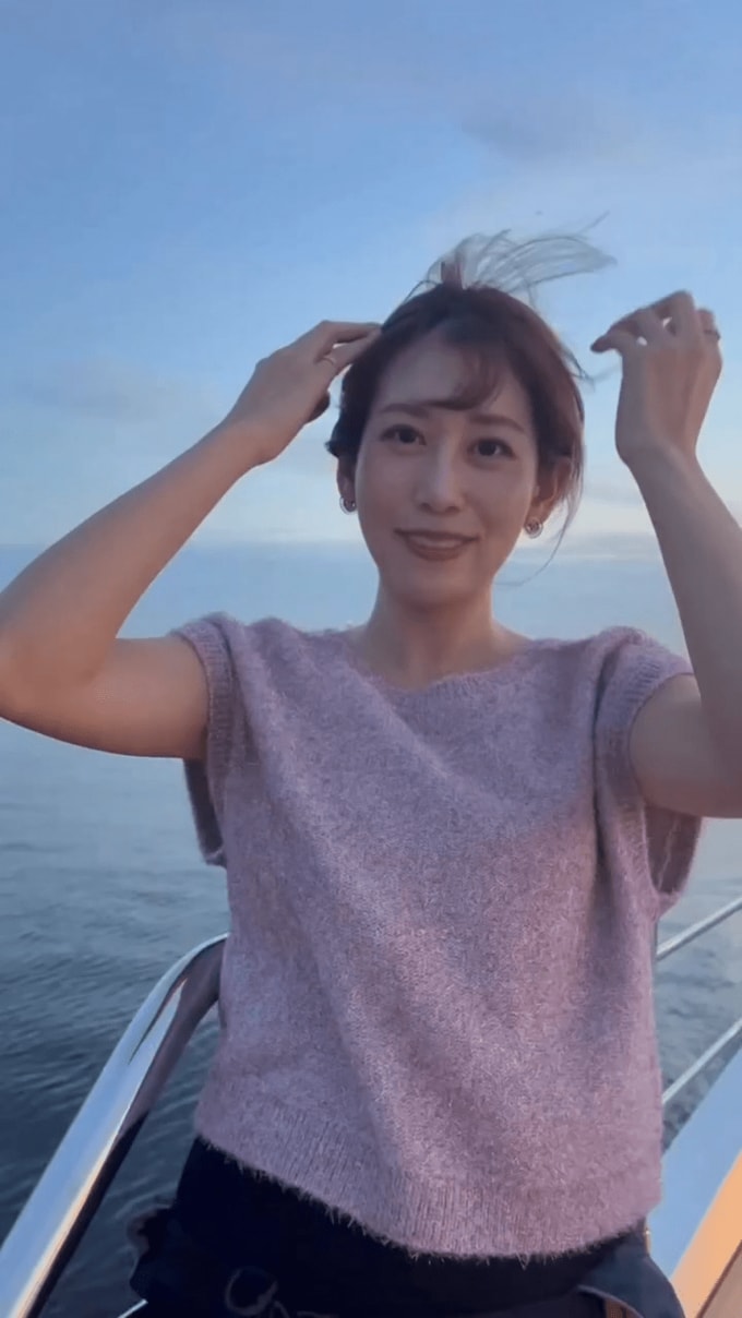 中川さんは、ノースリーブの薄い紫のニットを着て、薄闇が迫る海上にいる動画を投稿。「素敵なクルーザーで、普段は見られない景色をたくさん見させていただいて感激だった夜」とテキストしています。