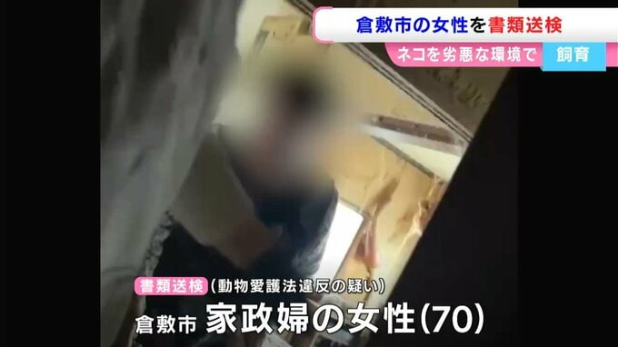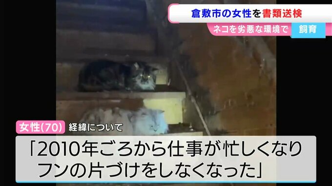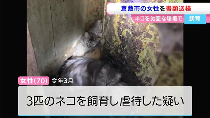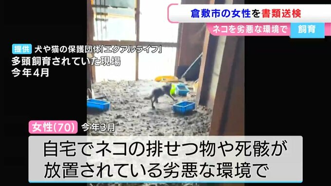 警察によりますと、女性は今年3月、倉敷市の自宅で、ネコの排せつ物や死骸が放置されている劣悪な環境で、