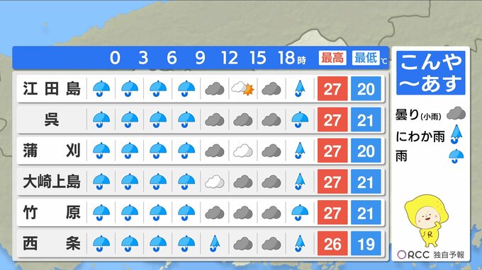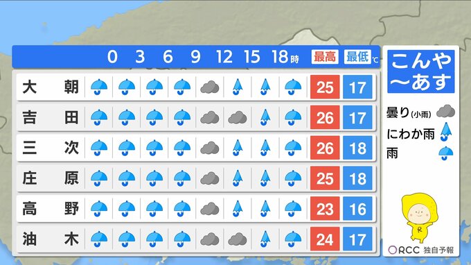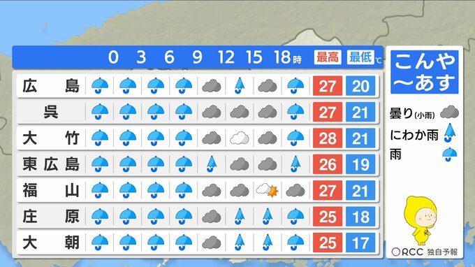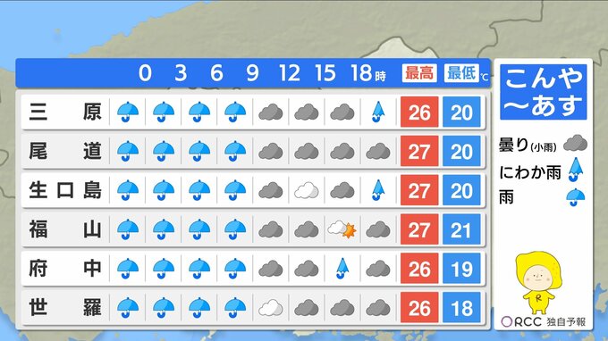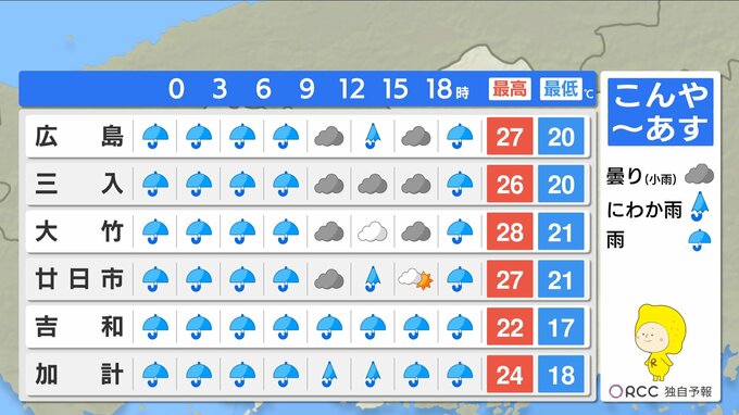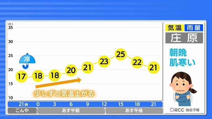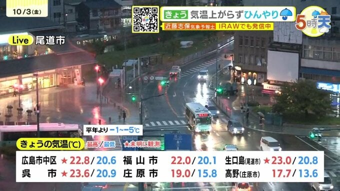 きょう3日(金)の広島県内は、雨の1日となりました。最高気温が未明に観測されたところも多く、日中は北風もあいまって肌寒い1日でした。きのうとくらべると、日中の気温は、5~8℃低くなっています。