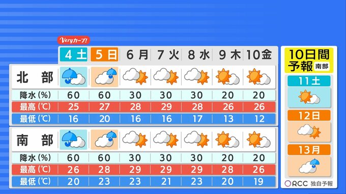 あさって5日(日)は、気圧の谷となり、午前中は雨が降りますが、午後からだんだんと弱まる見通しです。朝の気温が下がりにくく、沿岸部では寝苦しさを感じるかもしれません。日中も30℃近くまで上がる地域もあり、蒸し暑いでしょう。