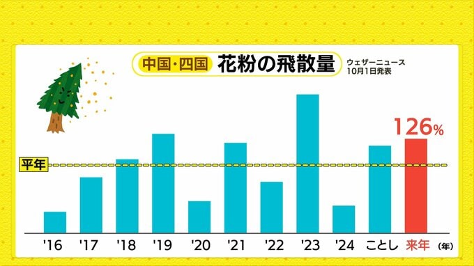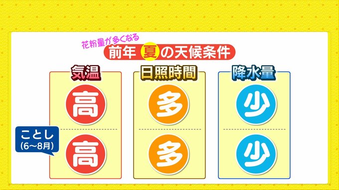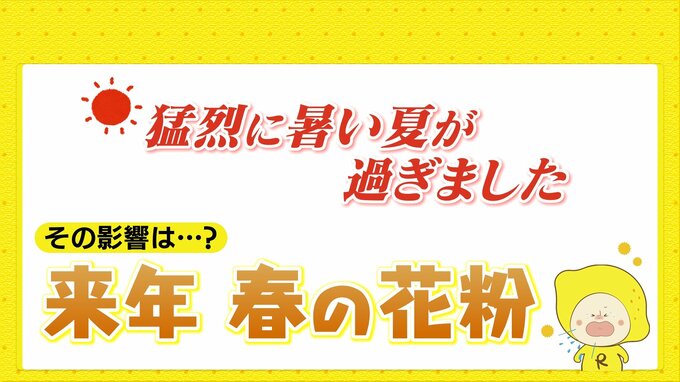毎週金曜は、生活に役立つ話題をご紹介しています。きょうは、夏の猛暑と翌年春の花粉量の関係です。夏の気温が高く、日照時間が多く、降水量が少ないと、春の花粉量は多くなります。ことしは、その条件全てが揃っています。来年春は、平年よりも多くなる予想です。