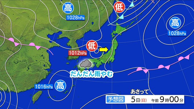 5日(日)低気圧はだんだん離れ雨は次第に弱まる